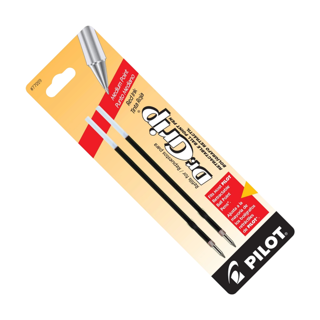 Produce precise, elegant handwriting when you use these Pilot Dr. Grip Ballpoint Pen Refills in Red, which feature quick-drying ink to prevent messy smears and smudges. The smoothly flowing ink of these Dr. Grip retractable pen refills makes writing consistent lines feel effortless. This pack includes two refills.