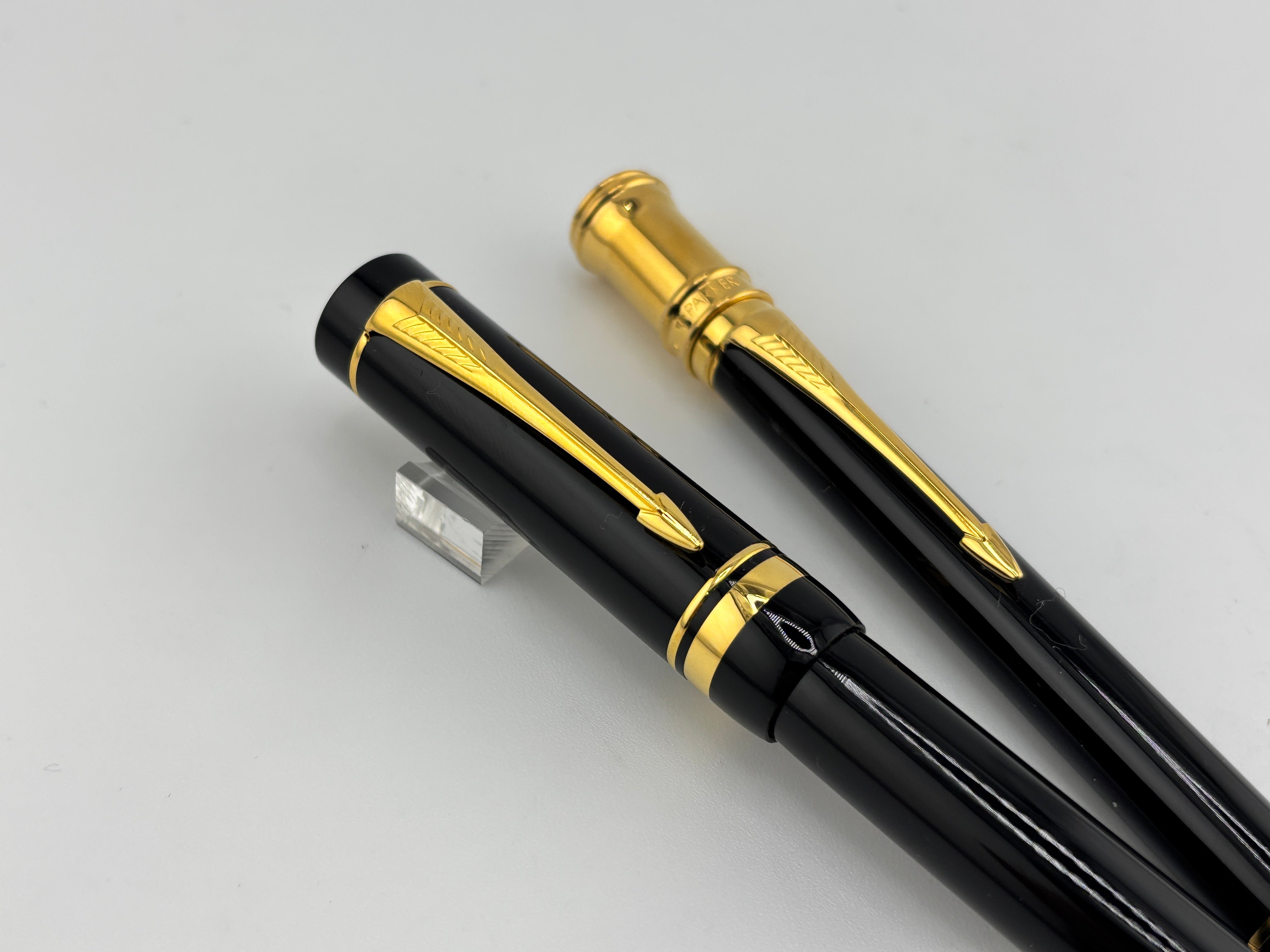 Parker Limited Edition World Memorial Black Duofold International Fountain Pen and Ballpoint Pen Set - Proceeds from the original sale were donated to world disaster relief in memory of lives lost in 20th century wars - The call to arms whistle logo metal in the