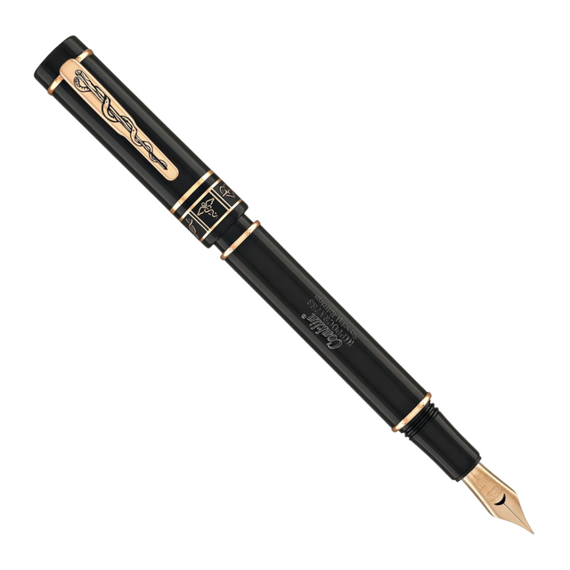 Renowned as the "Father of Western Medicine," Hippocrates, was born in 460 BCE in Kos, Greece, leaving an enduring legacy that continues to shape contemporary healthcare practices to this day. The Conklin Hippocrates family of writing instruments make the perfect gift for anyone just entering the profession, or as an elegant, everyday tool for even a seasoned practitioner. The collection features a European-grade, hand-crafted smooth resin. The glossy black body is adorned with 18KT gilded rose gold elements representing iconic medical symbols, including the stethoscope, Bowl of Hygeia, DNA string, Heartbeat sign, Caduceus, and the Star of Life. The top of the cap boasts an 18KT gilded rose gold coin depicting Hippocrates, while the clip showcases the renowned rod of Asclepius in 18KT gilded rose gold. The Hippocrates Collection is available in three distinct writing modes: Fountain pen • Rollerball pen • Ballpoint pen The fountain pen boasts a premium 18KT gilded rose gold stainless steel nib, made in Germany by JoWo, the preeminent nib manufacturer in the world. Offered in six distinctive point sizes: Extra fine, Fine, Medium, Broad, Stub and Omniflex; the pen can easily be filled via standard international ink cartridges or high quality threaded piston converter (Included). The capped rollerball adds a touch of elegance and practicality with its smooth writing refill. Standard international refills in a myriad of point sizes and colors are available. The twist-action ballpoint pen offers the longest possible refill life without sacrificing writing performance. Industry standard Parker® Soft Roll™ style ballpoint or Gel refills are widely available. The Conklin Hippocrates fountain pen is presented in a deluxe gift box, accompanied by a 30 ml themed ink bottle. Similarly, the rollerball and ballpoint pens are elegantly packaged in luxury gift boxes with dedicated themed sleeves, making it the perfect gift for any member of the profession. Experience the Conklin Hippocrates Collection – a harmonious blend of historical reverence and contemporary elegance that elevates the simple act of writing to a higher plane.