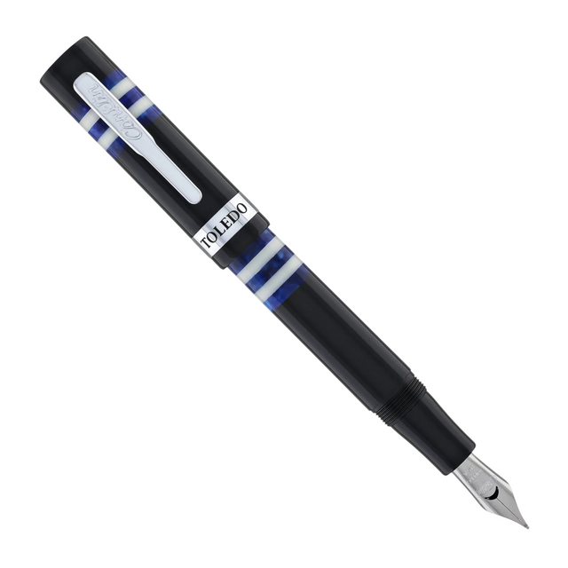 Toledo is available in fountain pens and ballpoint pens. The ballpoint pen activates with a twist mechanism and accepts standard Parker® style ballpoint or gel refills. The fountain pen fills via cartridge or piston ink converter (included) and is equipped with a premium JoWo stainless steel #6 nib personalized with the Conklin name, the historic “Toledo, USA” mark, and a crescent-shaped breathing hole. The nib is available in Extra Fine, Fine, Medium, Broad, Stub, or Omniflex points.