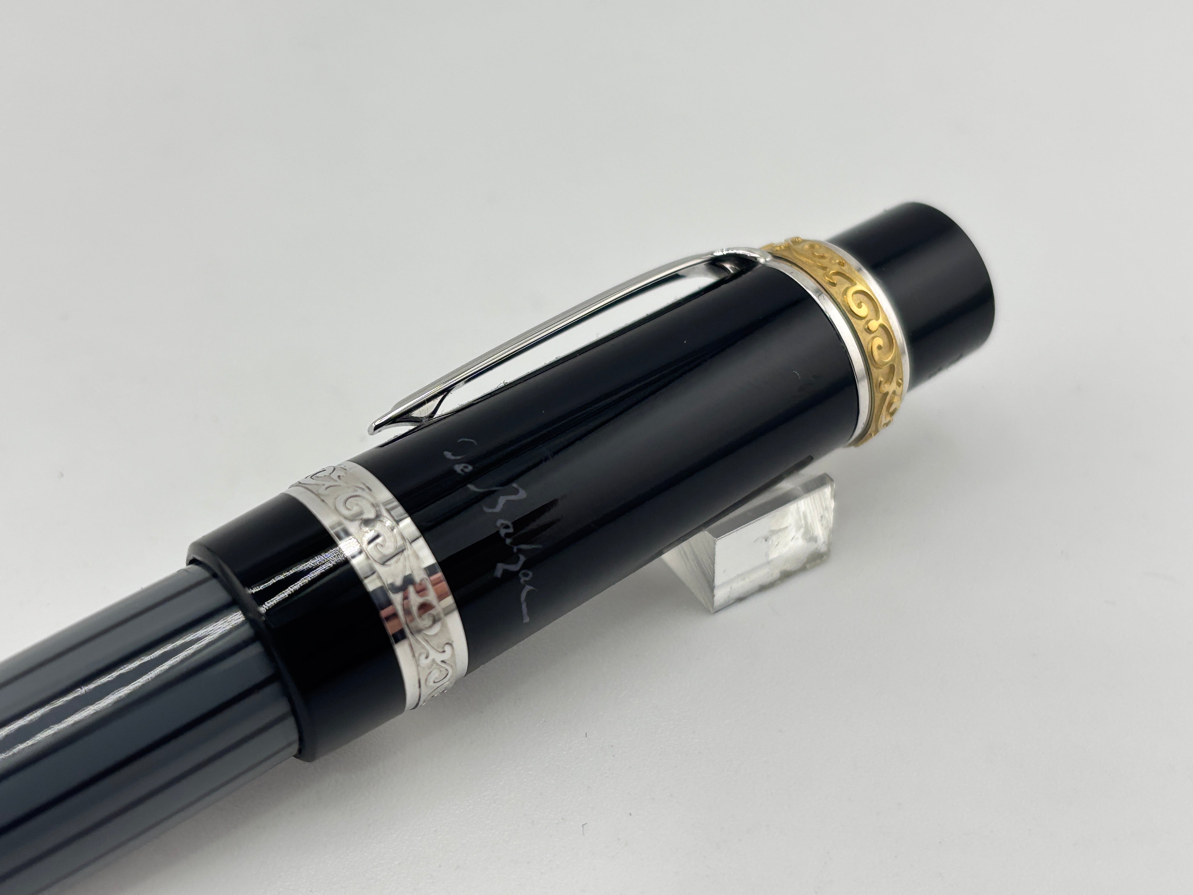 A Montblanc Writer's Edition pen commemorating the French novelist Balzac. The Honore de Balzac pen is designed to capture the spirit and presence of the famous playwright with its black precious resin and grey lacquer barrel and platinum-plated clip and fittings.