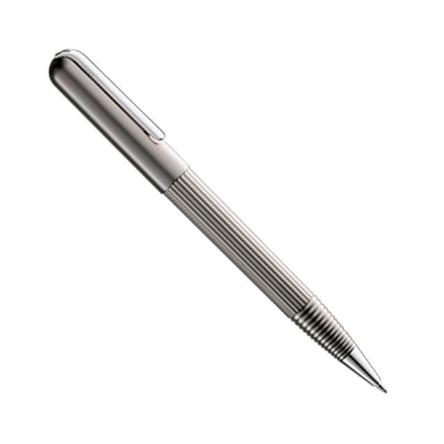 The Lamy Imporium series, designed by Mario Bellini, effortlessly unites attitude and style. The characteristic body of straight lines is technically striking, making it completely individual and unique û while contrast is provided by the firmly cylindrical screw on cap. The fine ridges on the pen give a striking and streamlined appearance to the pen, while the smooth surface of the cap offers a great contrast to the lines on the body with the excellent clip blending in to the top of the cap and gradually exposing the full shape of itself along the sides of the cap. The finial on the end of the barrel has a coin embedded in it. This combination of shapes lends the series û featuring fountain pen, rollerball, ball pen and mechanical pencil in titanium matt and black matt finishes û its classic and timeless appearance. The black matt finish is available with either black or gold elements and the titanium matt has platinum elements. All models are refined and partially galvanized with an especially high-end PVD coating. The fountain pen features a 14kt Bi-color nib, striking in appearance without a hole, in M,F,XF and is cartridge/converter (included) fill.