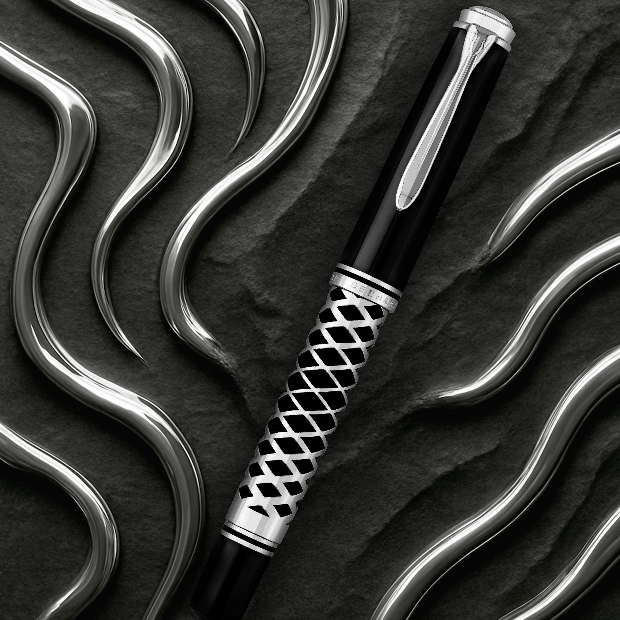 The metal sleeve, precisely cut with a geometric pattern and carefully placed onto the barrel like a jewel, creates a captivating contrast of surfaces and textures. This intricate overlay adds a unique tactile dimension while giving the pen an unmistakably modern and industrial character — bold, architectural, and striking in its precision.