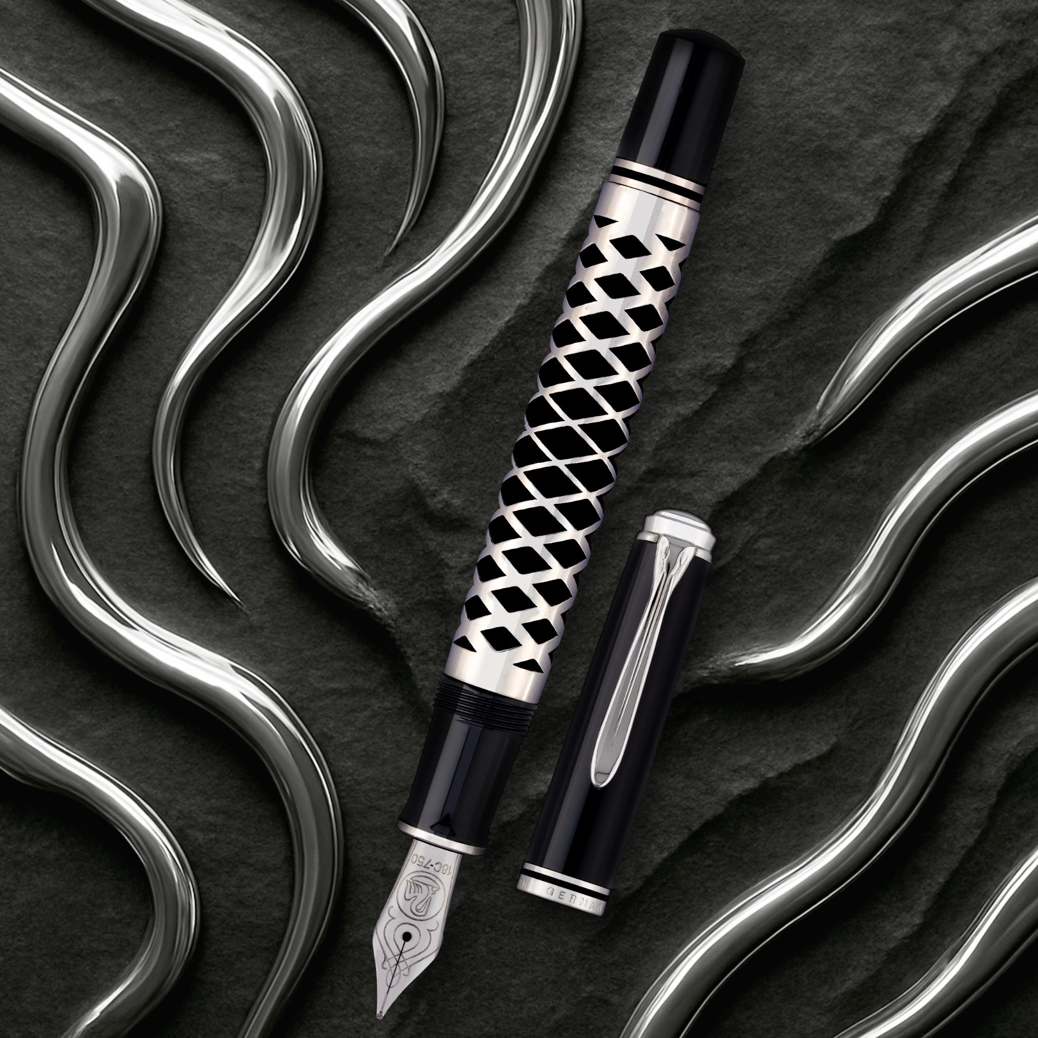 Introducing the Pelikan M805 Metal Sleeve, a bold evolution in fine writing instruments. Designed for those who value innovation and distinctive aesthetics, this special edition brings together two refined materials: a polished black acrylic barrel and a meticulously lasered silver metal sleeve.