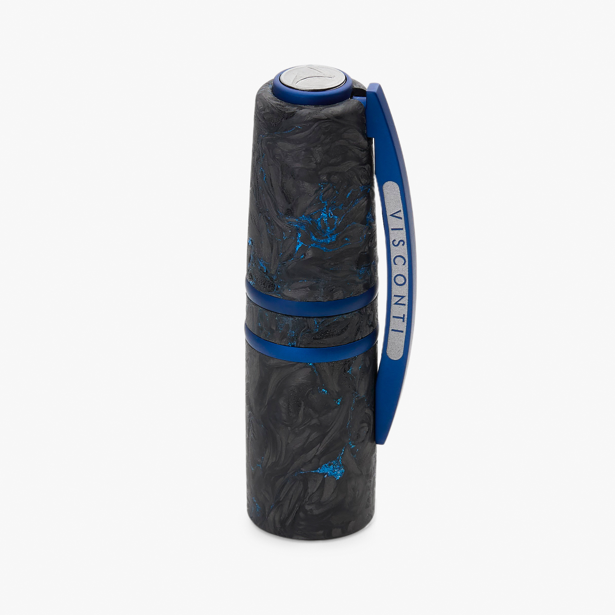 Its signature double reservoir barrel is enhanced by a transparent acrylic ring that reveals the ink level, even when closed. All metal components are crafted from Ergal, a lightweight aerospace alloy, anodized in deep blue for increased durability and a bold visual identity.