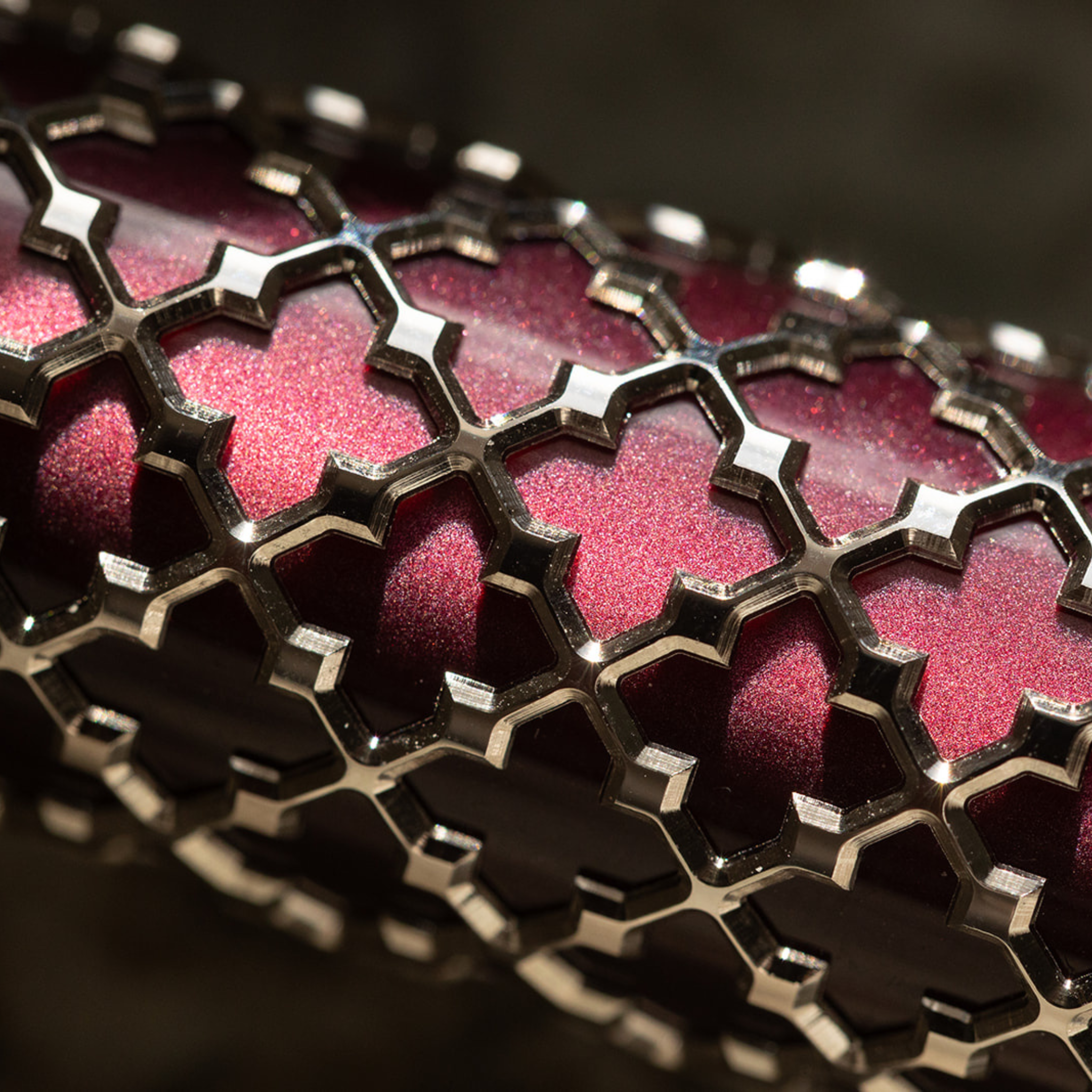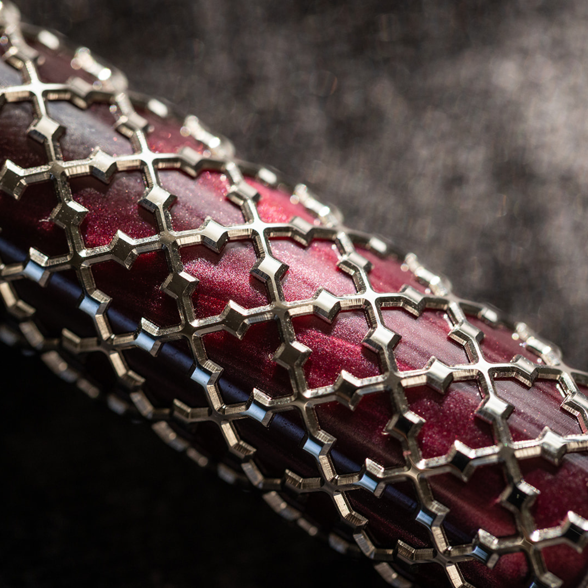 A delicate sterling silver filigree overlays an inner iridescent red resin, creating a striking interplay of light and texture. The deep, vibrant hue recalls the velvets and noble textiles of Venetian palaces — surfaces that shift and glow under changing light. The contrast between precious metal and luminous resin enhances the perception of depth, giving the pen a warm, rich, and captivating elegance.
