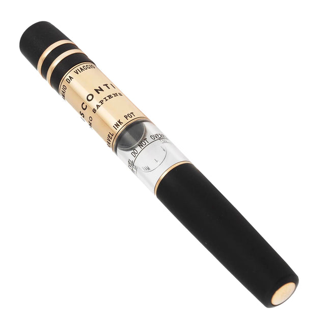 The inkwell, specially designed to refill fountain pens during travel, is made of volcanic lava powder from Mount Etna and resin. The metal fittings are in bronze and engraved in house by Visconti's craftsmen.