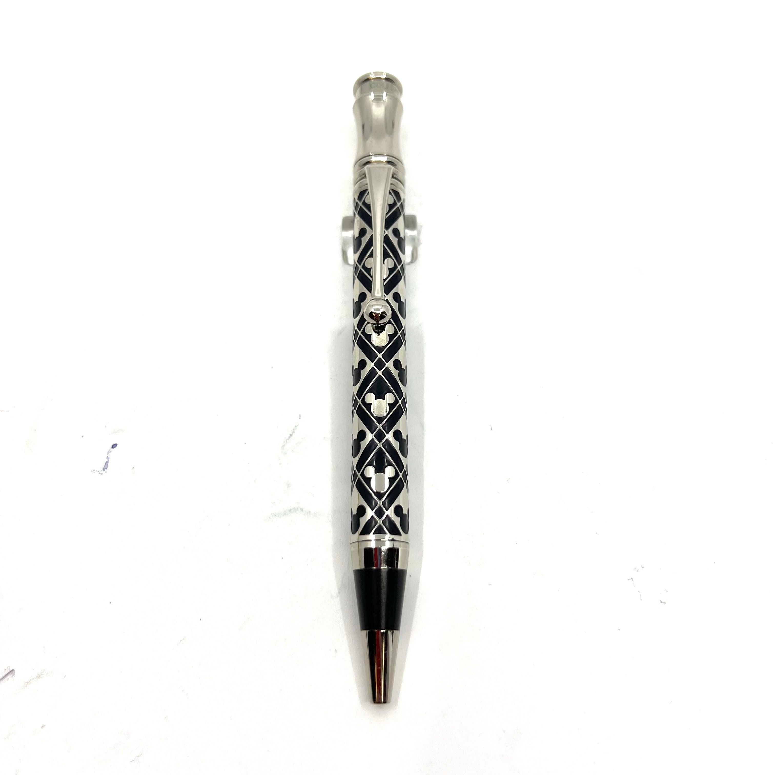 Colibri Deco Mickey Mouse Silver Metal Ballpoint Pen - Cut-Out Silhouette Of Mickey's Head Appears Throughout/Alternating Black & Silver - (c)Disney Copyright Notice on Pen- Twist Action - Accepts Parker-style Ballpoint Refills - Ca.1990s - No Original Box - Virtually Mint - $75