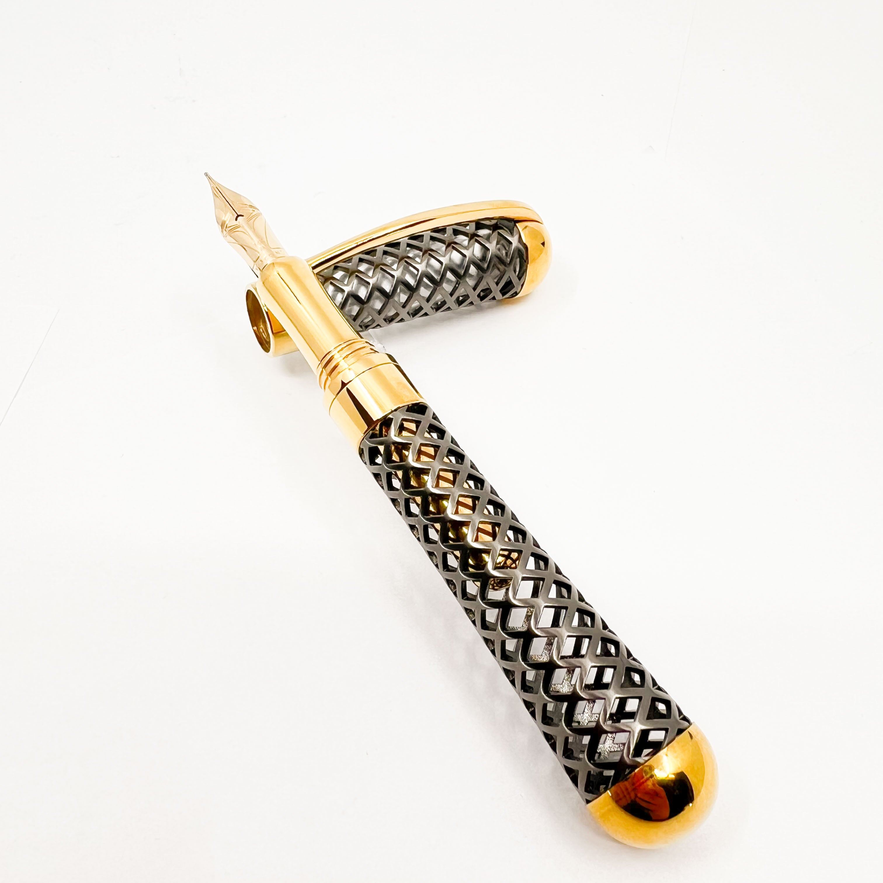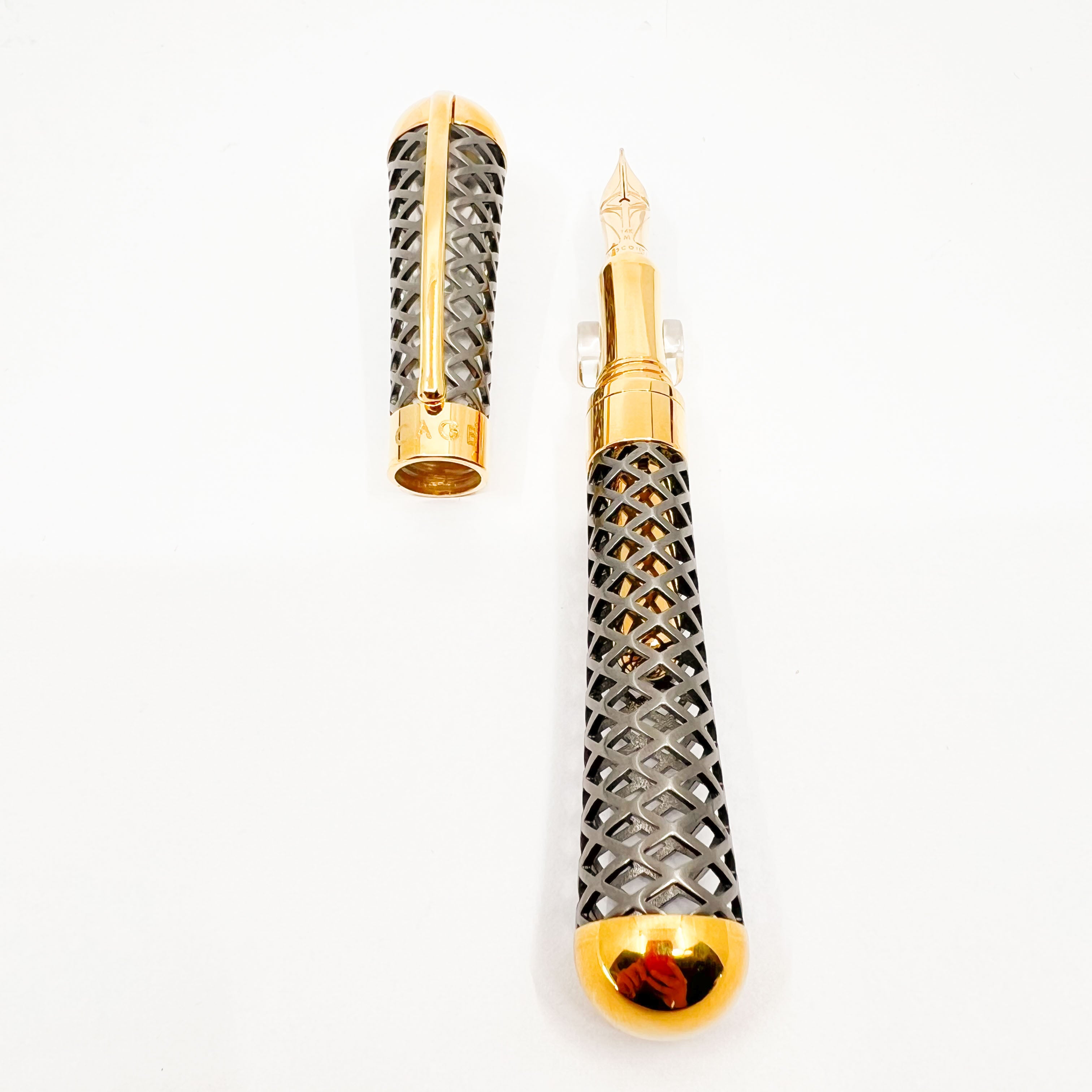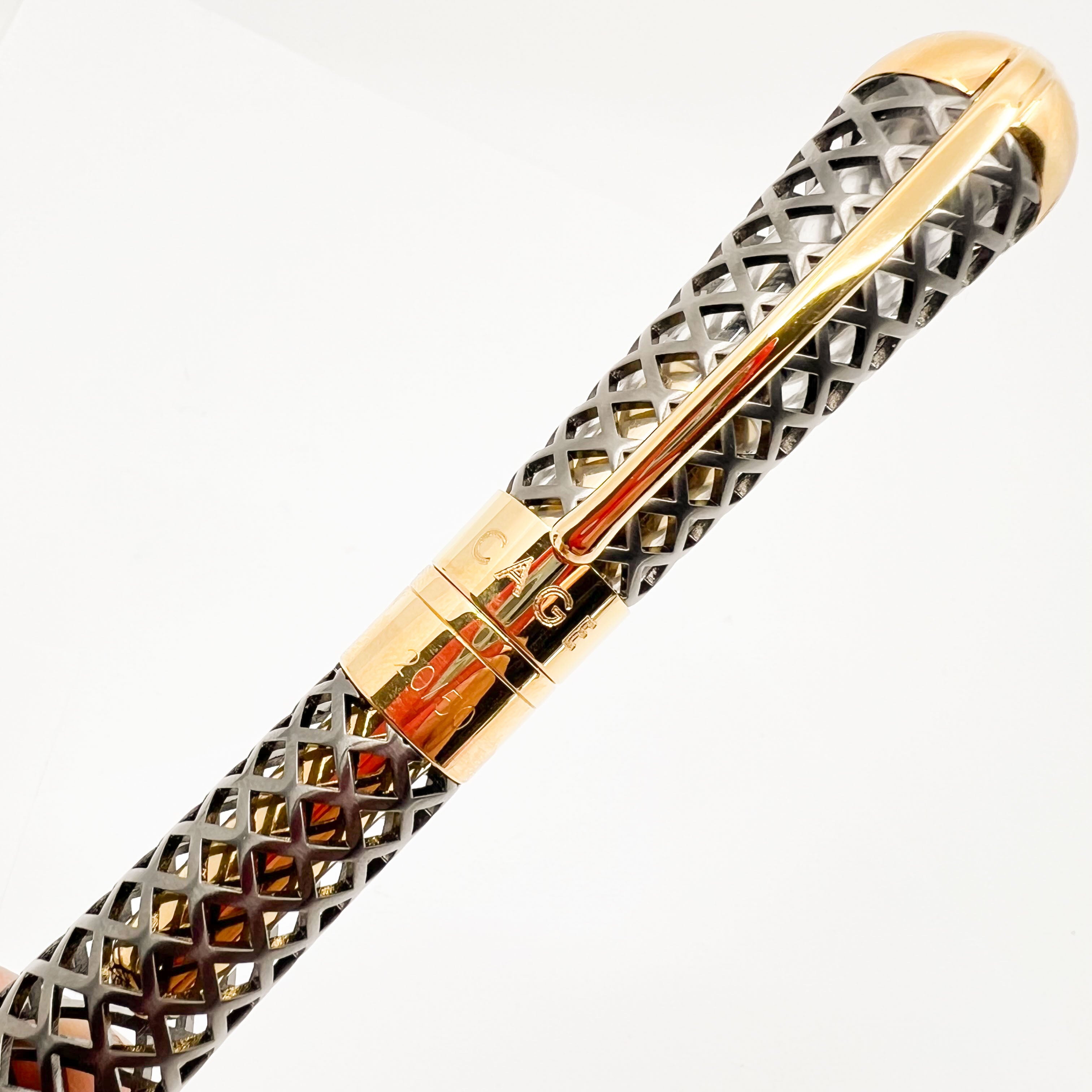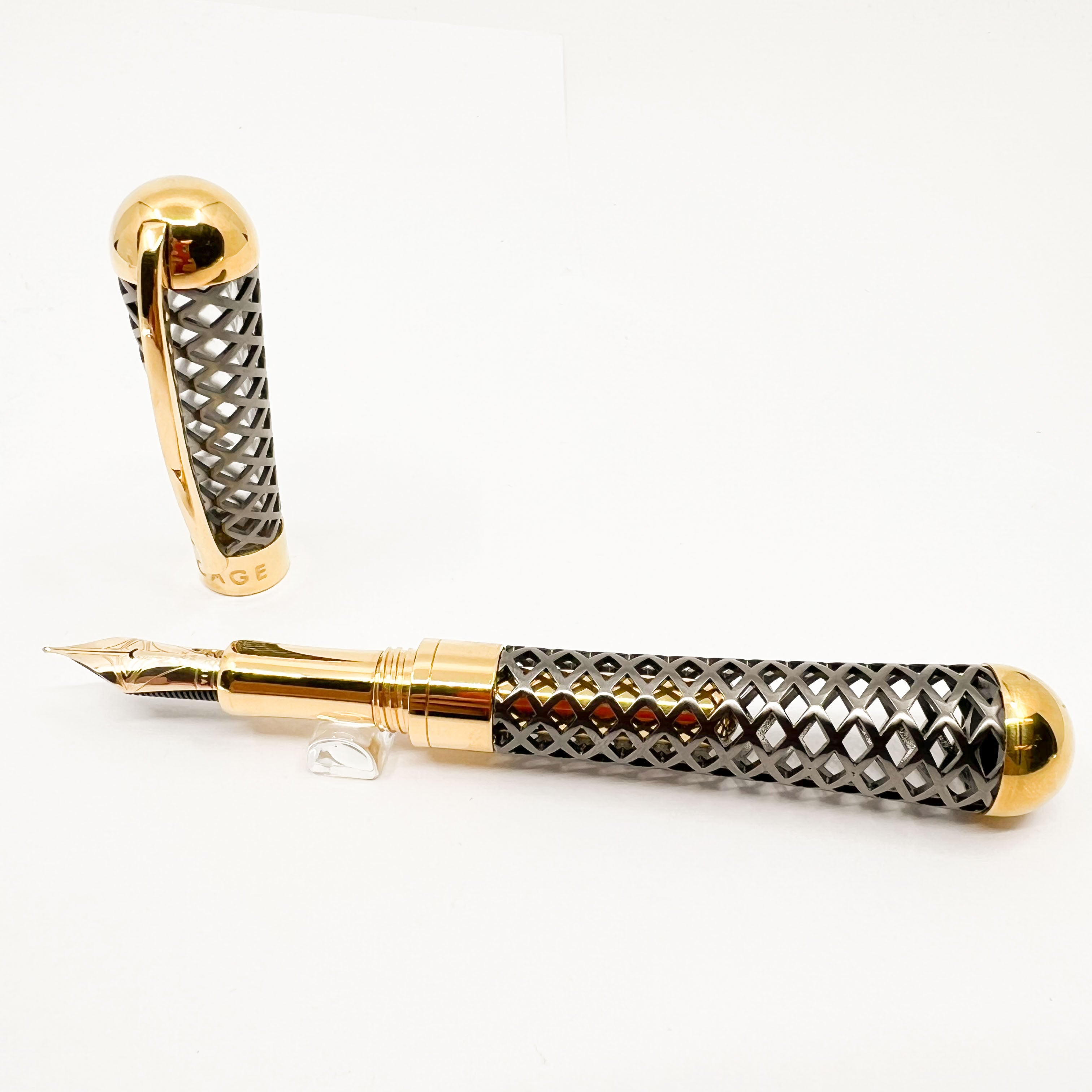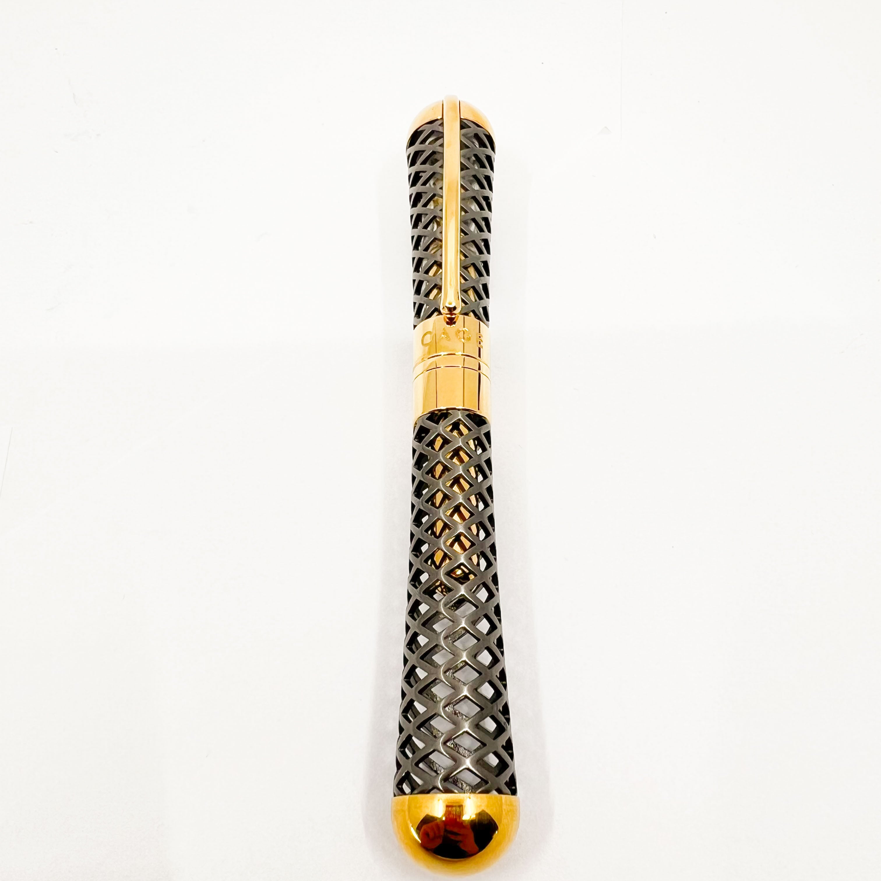 The Innovative Visconti Black Diamond Cage LE Fountain Pen was designed by Marta Sansoni, internationally recognized Architect & Designer - #20 of only 50 Pieces Made - A Significant Change of Direction for Visconti as the Pen is Cartridge-fill only, with a Specially Designed Gold Plated Threaded Metal Cover to secure the Cartridge in Place - 2021 - Flexible Medium 14kt Gold Nib - Original Box/Paperwork - Offered in Italy only - Mint - $650