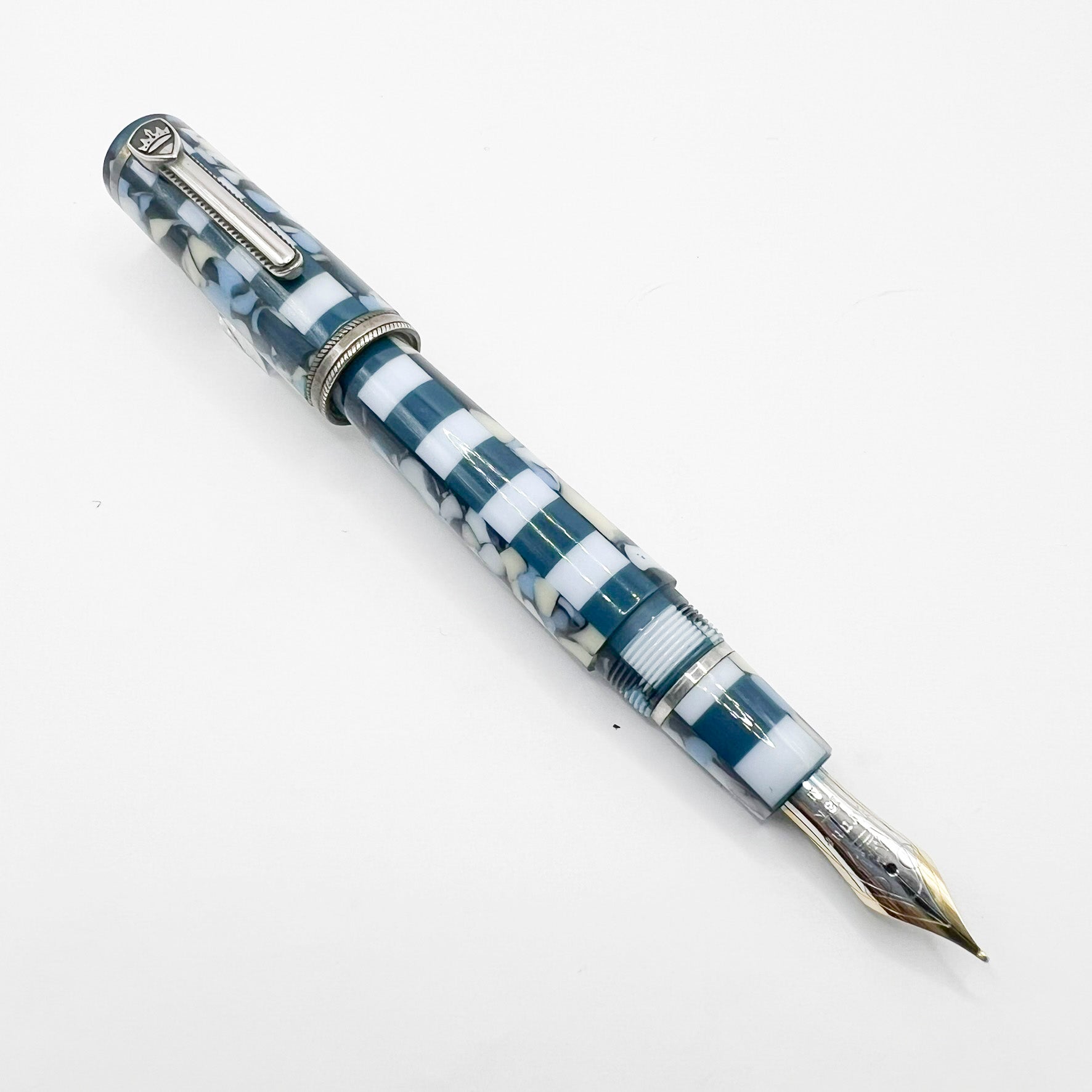 Krone Dissonance in Alternating Marbled Blue & Block Motif Fountain Pen - Medium 18 Kt Gold Nib - Exceedingly Funky!