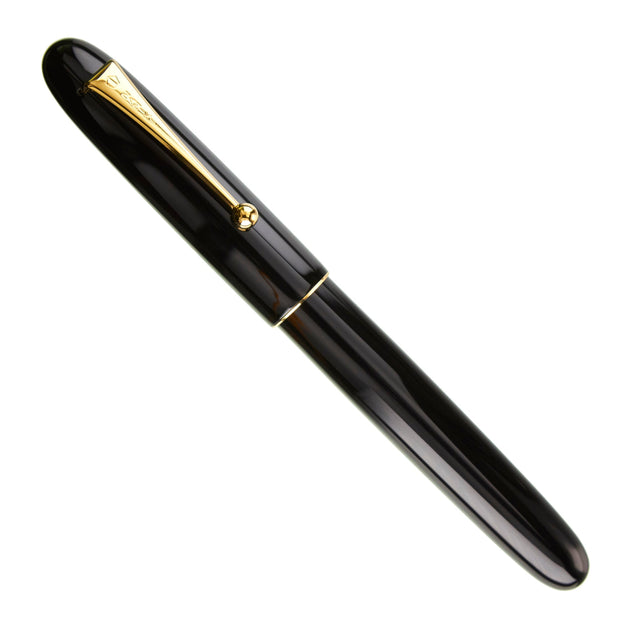 This solid black lacquer Namiki Yukari Royale Urushi is the quietest of the Yukari Royale collection. Unlike the Urushi Vermilion, whose most unmistakable feature is its red body and feed, this Urushi makes a statement in black. The black color appears to both simplify and amplify the fountain pen's design, and most clearly showcases the form of the pen. The gold metal cap lip is functional here as well, giving protection to an otherwise fragile part of the pen.