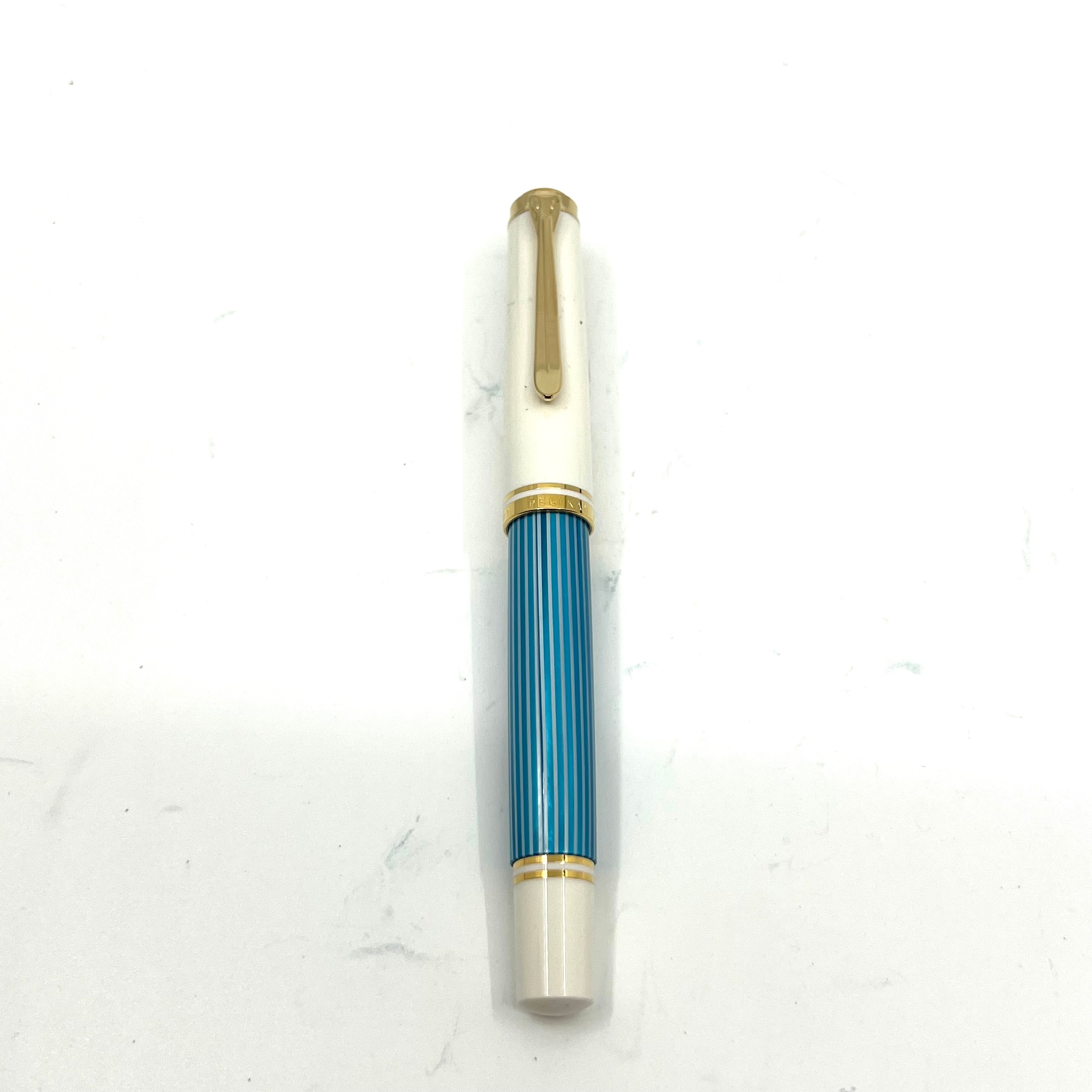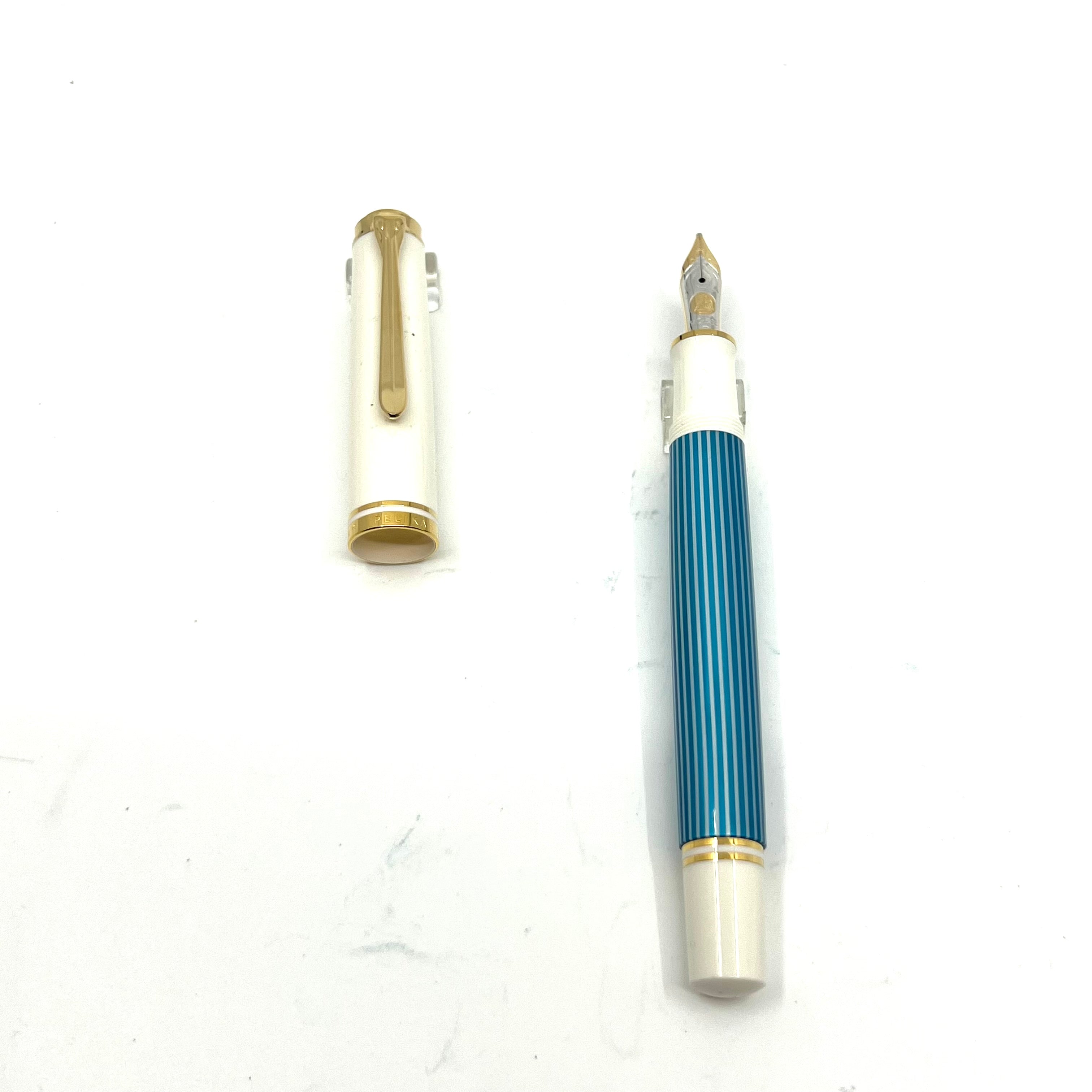 Pelikan M600 Turquoise-White Striped Fountain Pen - Gold-Plated Trim - Piston Fill - Broad 14kt Gold Nib - 2018 - No Original Box - Mint - $335