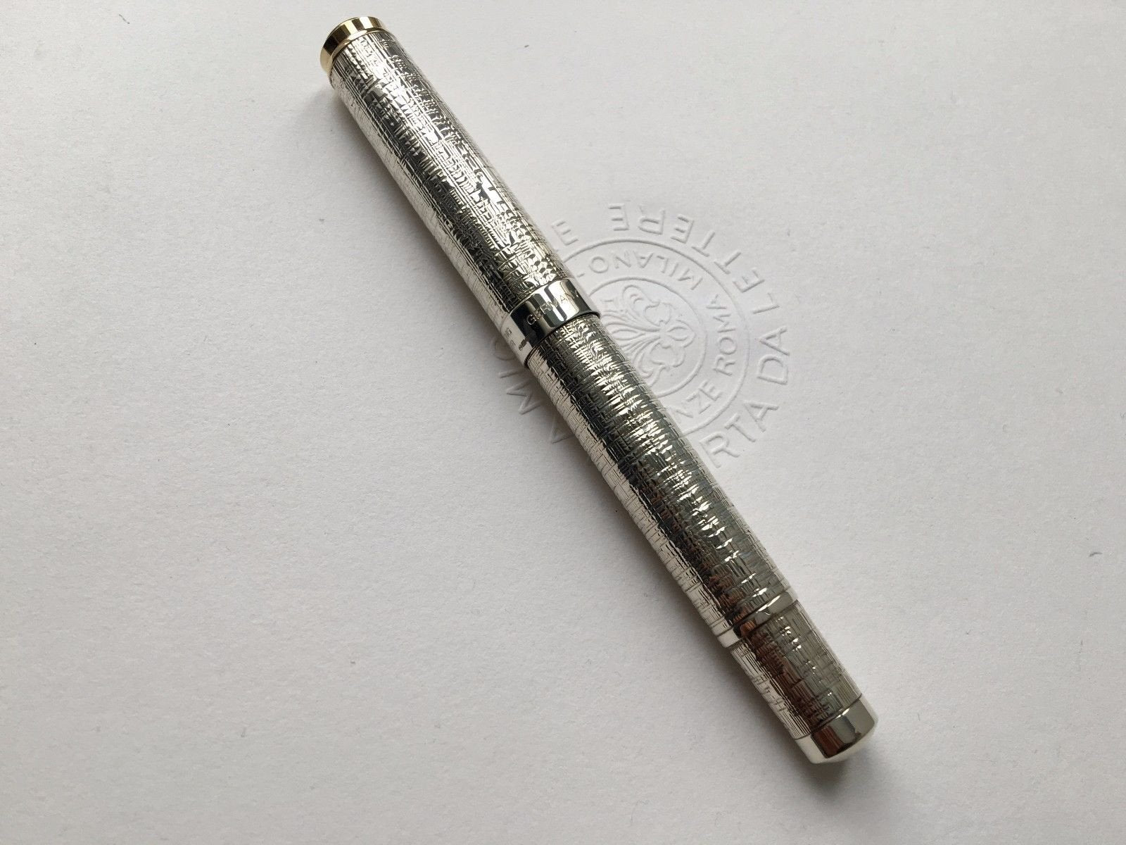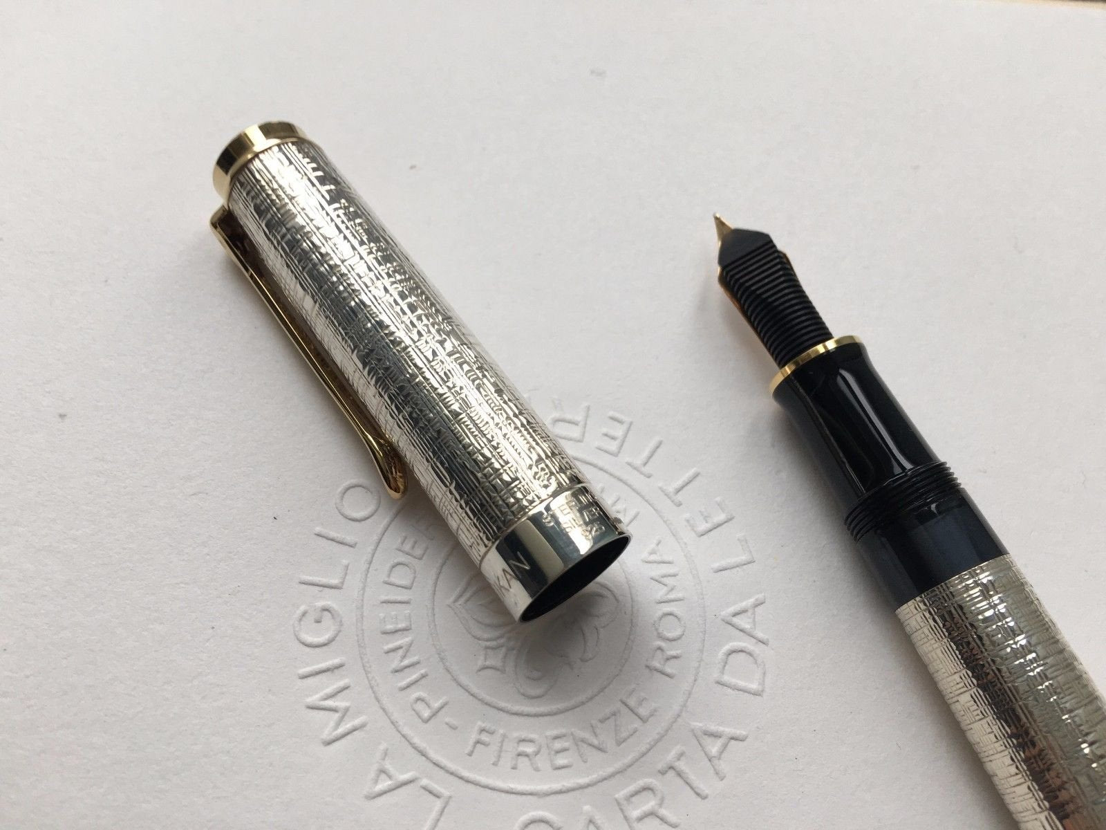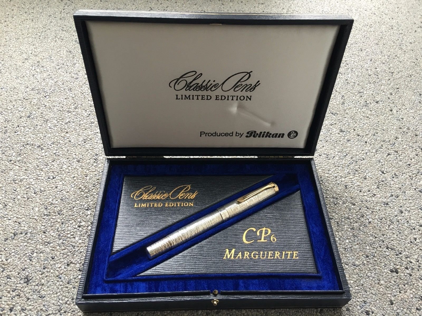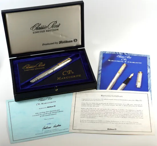 Full .925 Sterling Silver - The sixth limited edition in the Classic Pens CP series is the Goethe Pens Marguerite and Charlotte, the fruit of the cooperation among Classic Pens, Pelikan and Murelli - Series Launched in 2002 - Only 500 Marguerite Pens Produced - Original Boxes/Paperwork - Broad 18kt Gold Nib - $2250